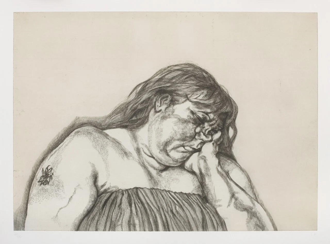 Woman with an Arm Tattoo, 1996, etching, courtesy of Austin/DesmondIn a recent interview with ROSA Magazine (Review of Sussex Arts), Sue Tilley, one of Lucian Freud’s regular sitters, called the artist “a monster, but a humorous monster”.