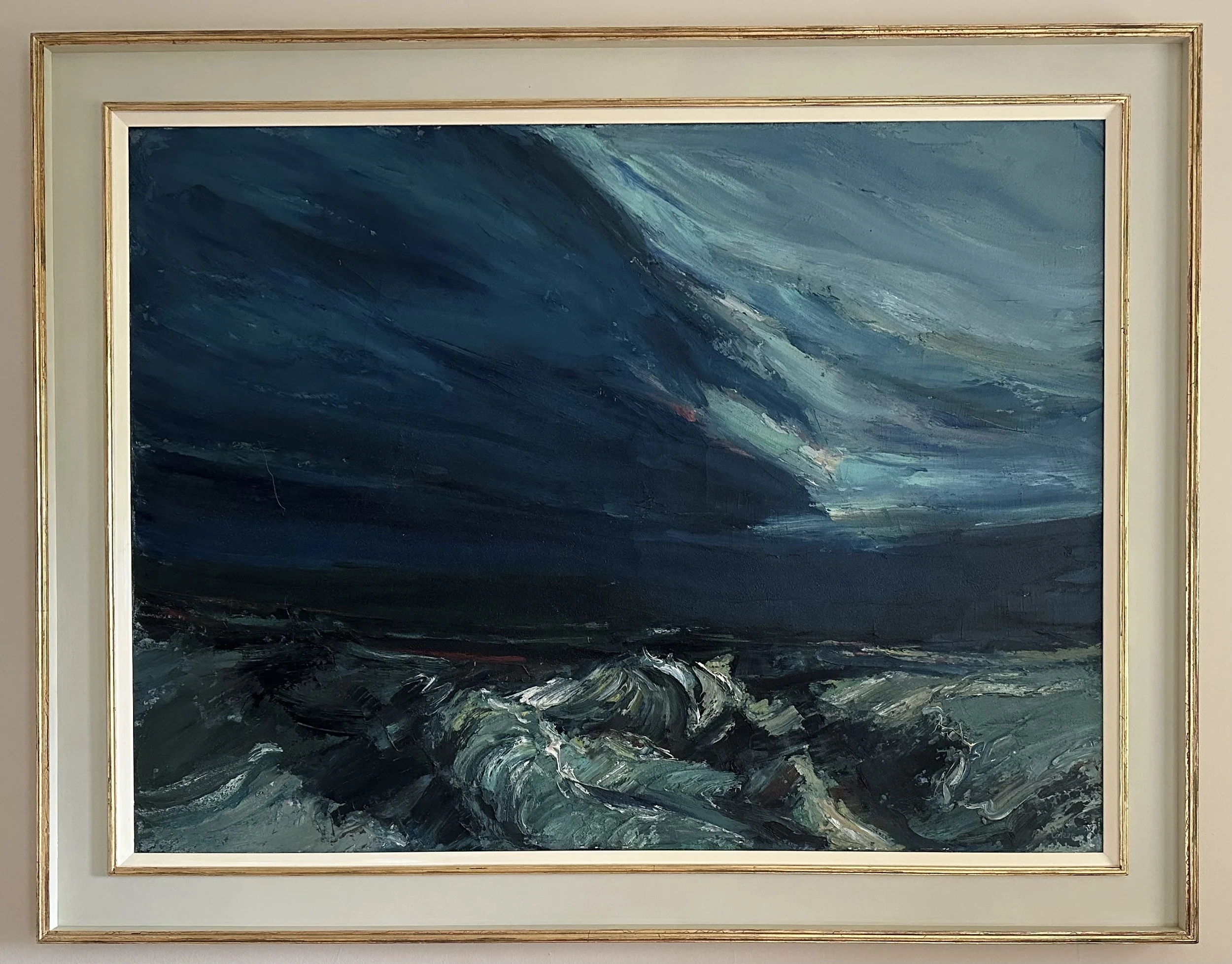 Nonetheless he continued to practice his own type of gritty and graphic realism throughout his life. As Jane Holdsworth (Flying Colours), who first exhibited him in 1990, writes: ‘Fascinated by the movement of weather and water and inspired by Turner, he sought subjects which revealed powerful elemental forces at work. Winner of two scholarships at the Royal College of Art and later a Royal Academician, Coker had a long and distinguished career, with work in around 50 public collections. Peter Coker is one of the foremost British realist painters of the 20th century.’