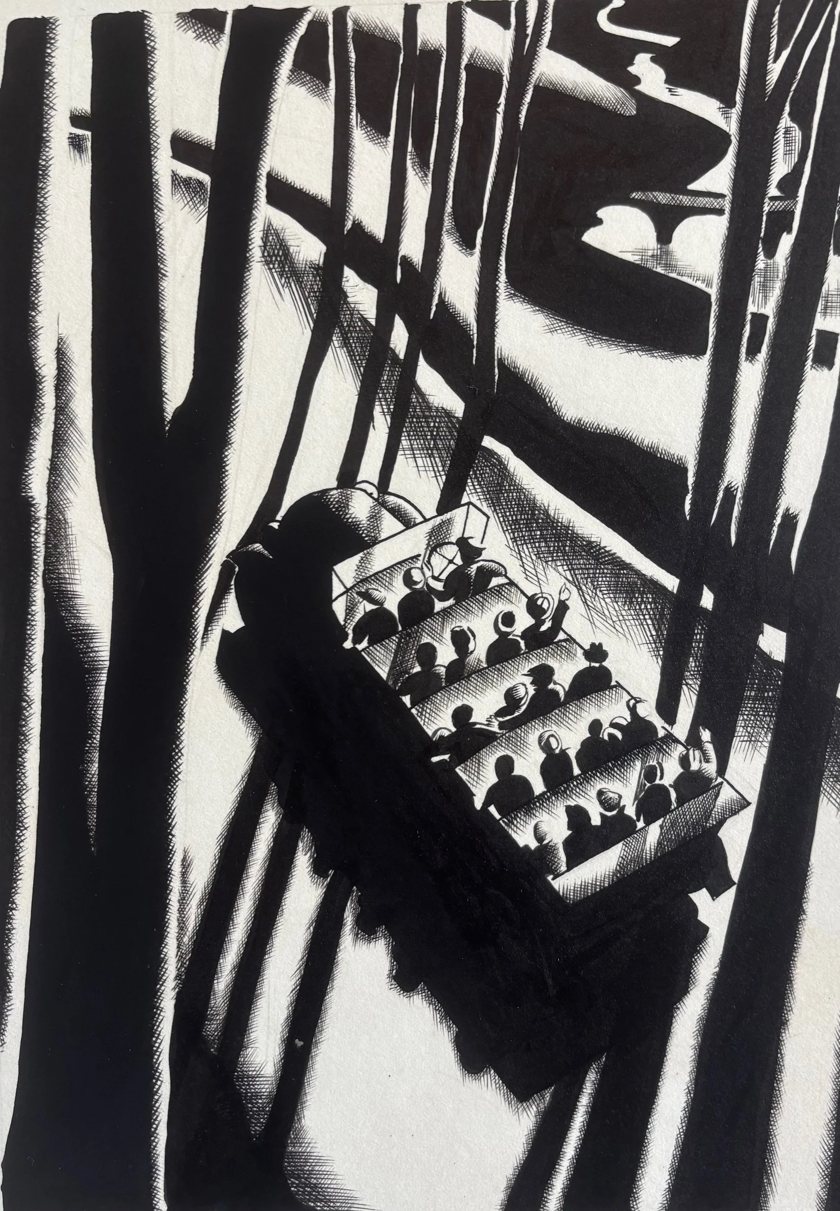 A freelance commercial illustrator whose dramatic chiaroscuro is comparable to the high art woodcuts of the German Expressionists . A committed socialist and Christian, Wragg tended to provide heavily politicised content for left wing publications, “A touch too hard-hitting to have become terribly commercial” says Moore-Gwyn. “But there is a case to be made for these striking black and white drawings.”